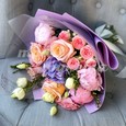 Пионы, розы и эустомы в коробке