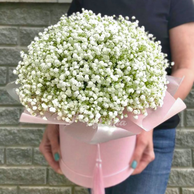 13 белых гипсофил в шляпной коробке
