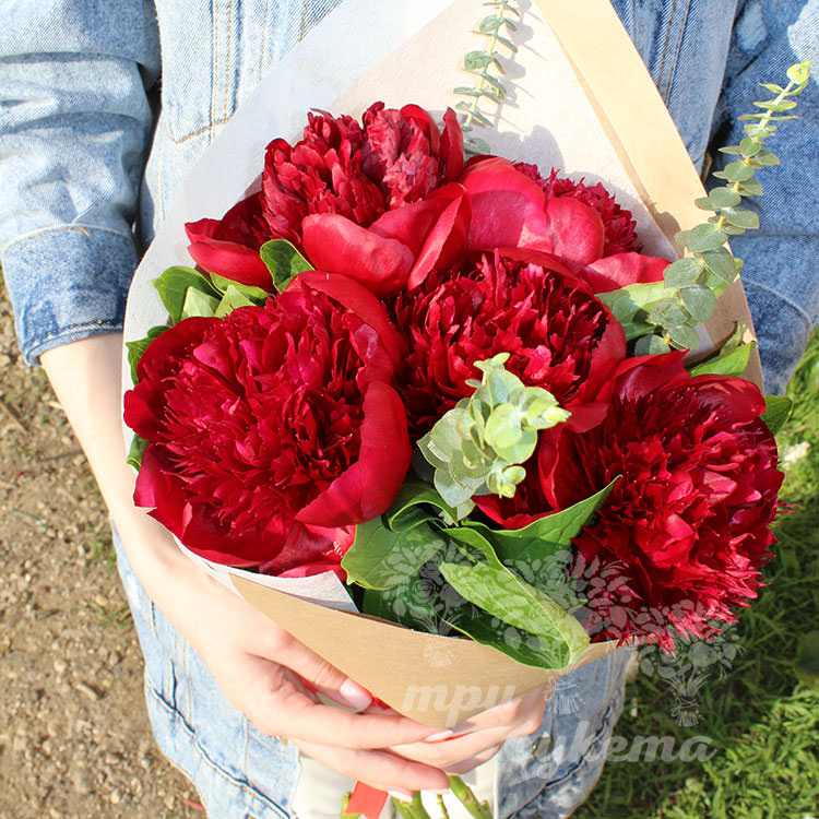 5 красных пионов Рэд Шарм