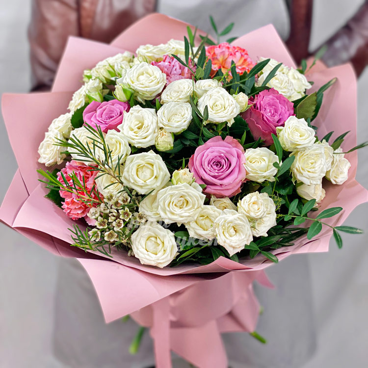 Букет белых куст. роз и розовых гвоздик