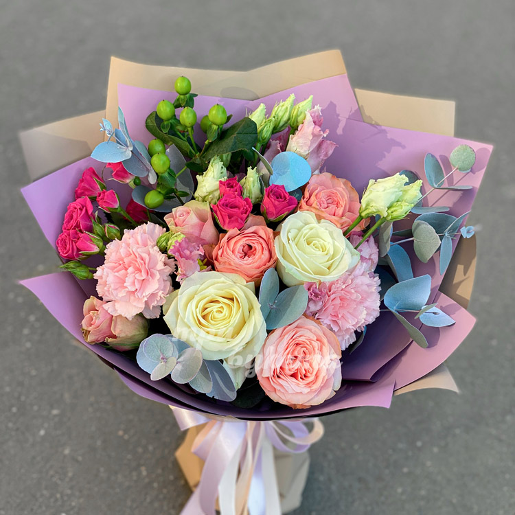 Букет из эустом, гвоздик и роз