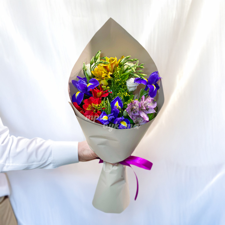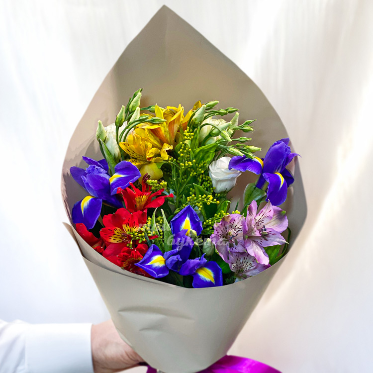 Букет из ирисов, альстромерий и эустом
