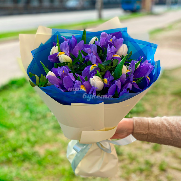 Букет из ирисов и белых тюльпанов