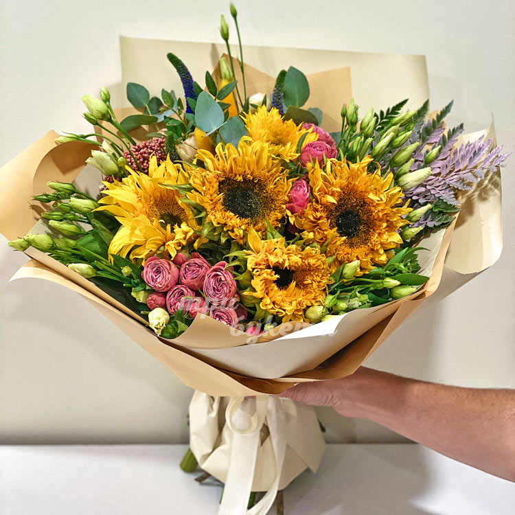 Букет из подсолнухов, роз и эустом