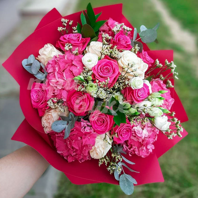 Букет из розовых роз и гортензии