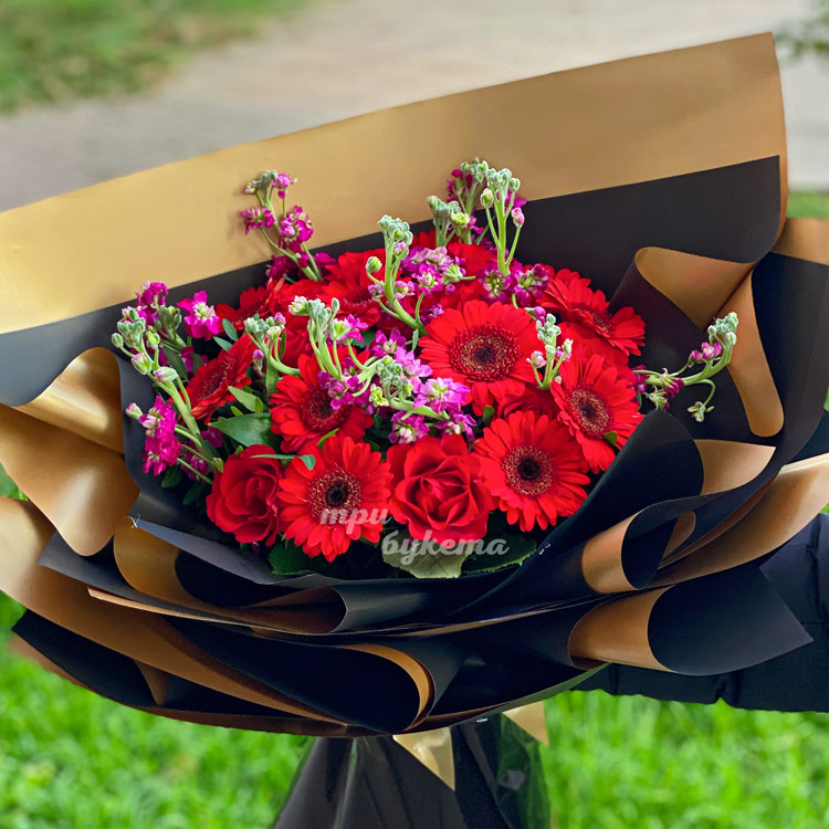 Букет красных гербер и розовых маттиол