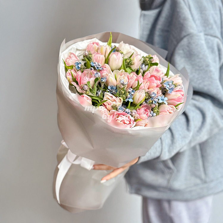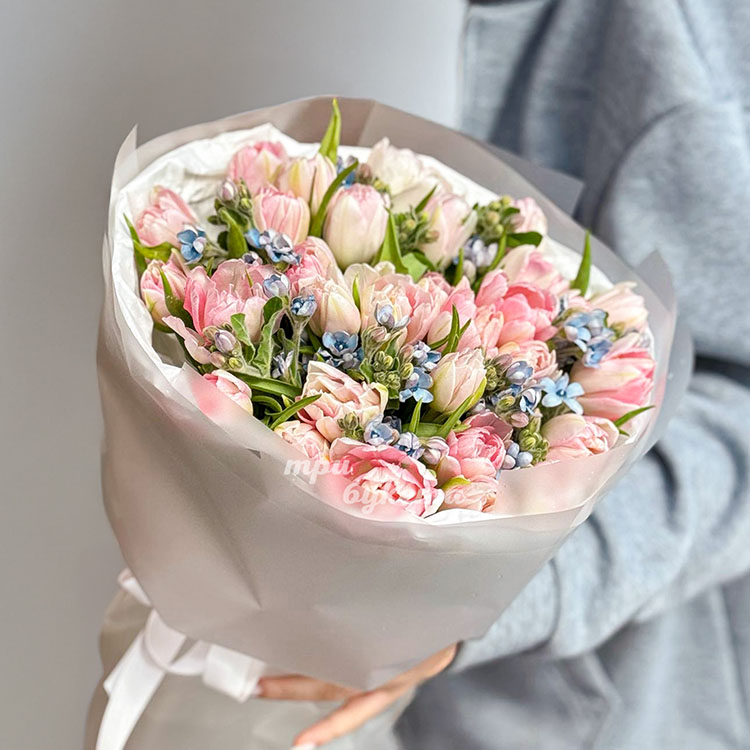 Букет розовых тюльпанов с незабудками