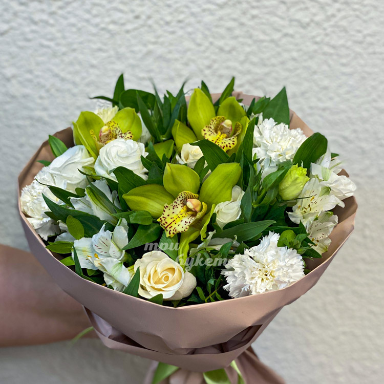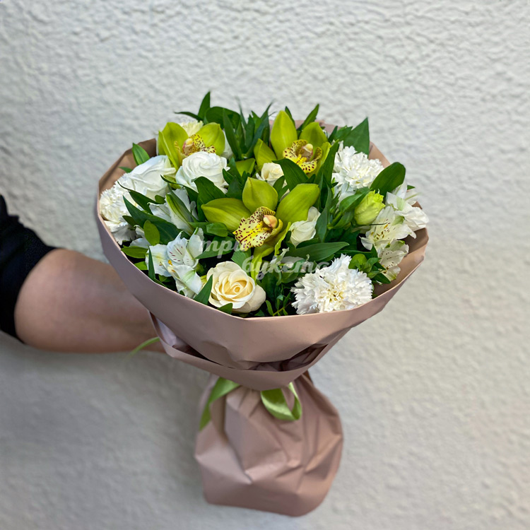 Букет зеленых орхидей и белых альстромерий