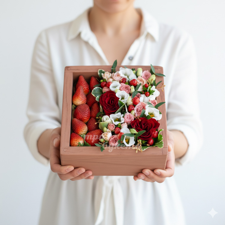 Клубника с цветами в ящичке