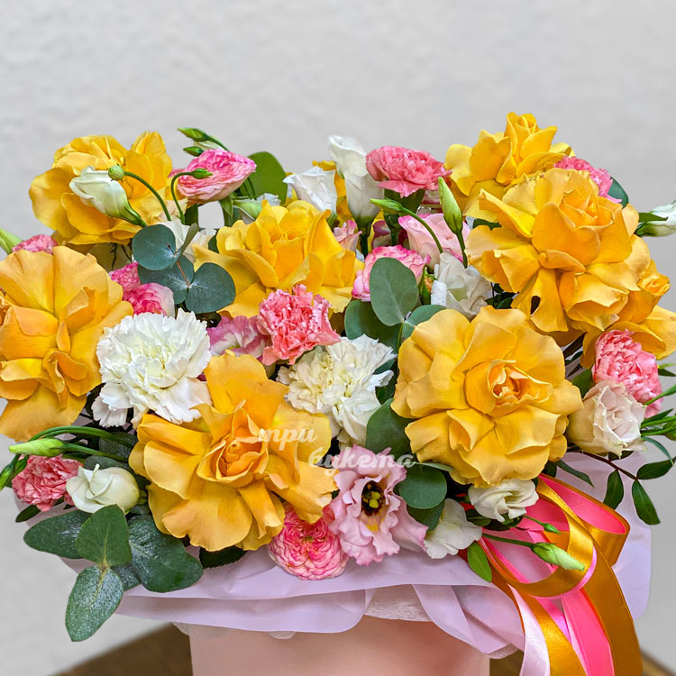 Коробка роз Топ-сан и розовых гвоздик