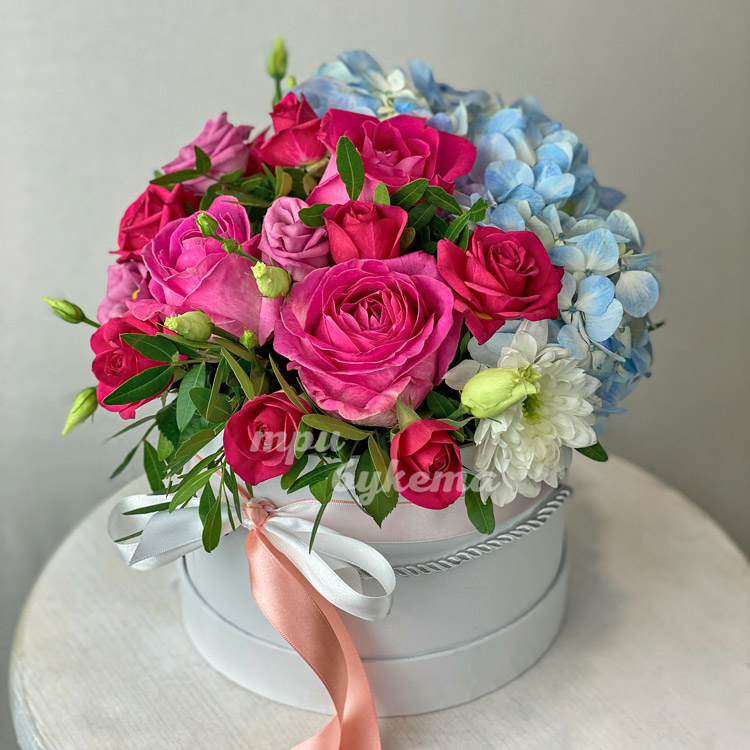 Коробка с голубой гортензией и розовыми розами