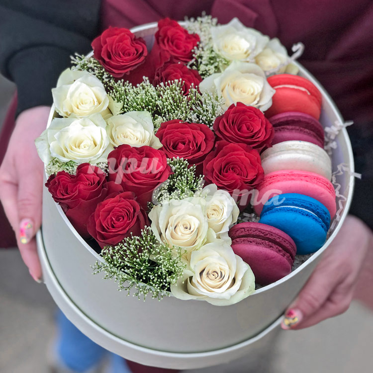 Коробочка с макарунами и 18 розами
