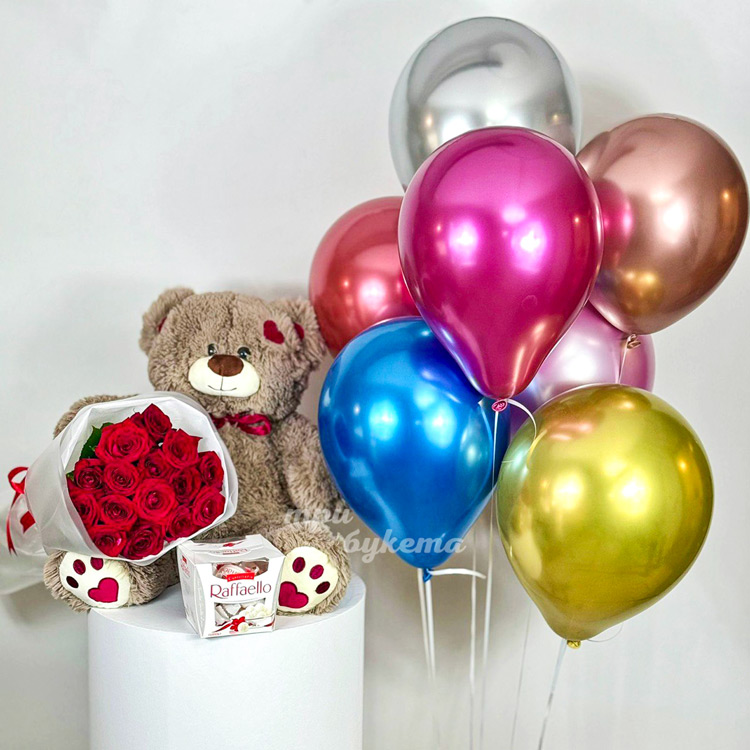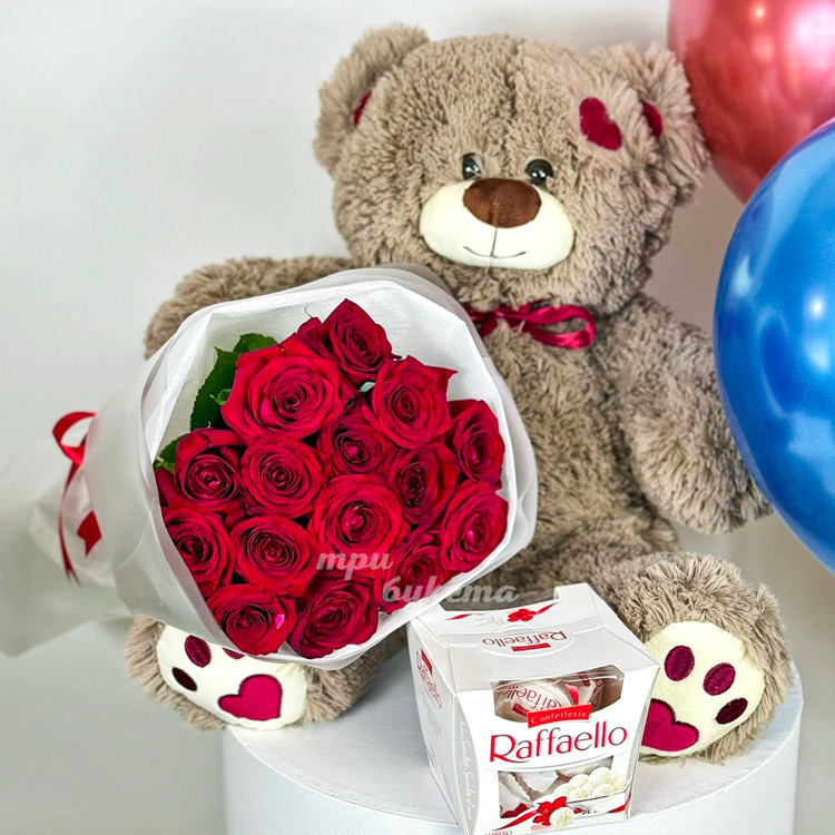 Набор из мягкой игрушки, шариков, конфет и 15 красных роз