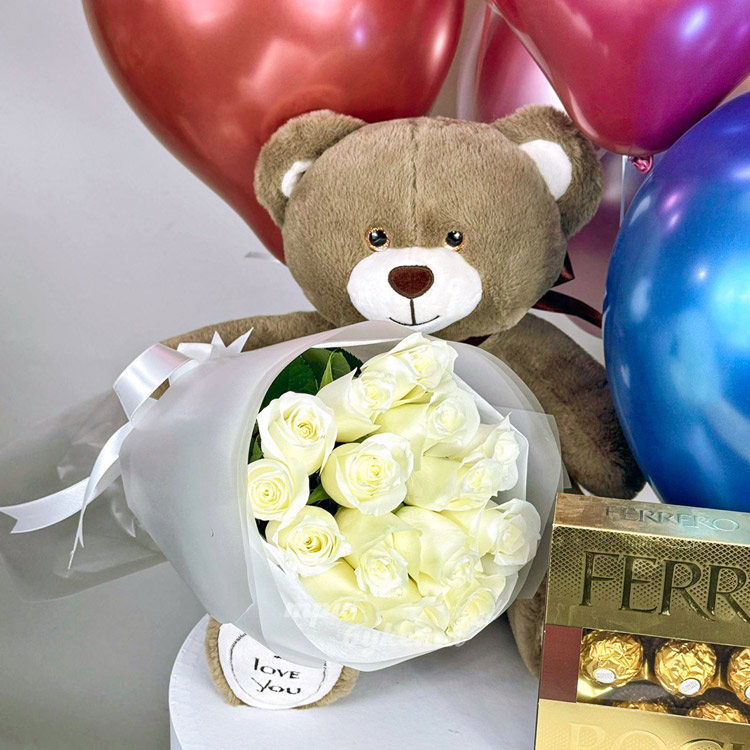 Набор из шариков, мягкой игрушки, конфет и 15 белых роз