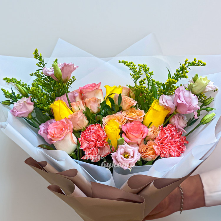 Яркие эустомы, гвоздики и розы в букете